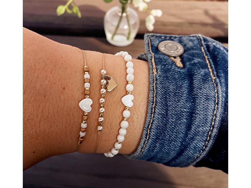 - Korálky: sklenené 3 mm, srdce zo sladkovodnej perlete 6 mm