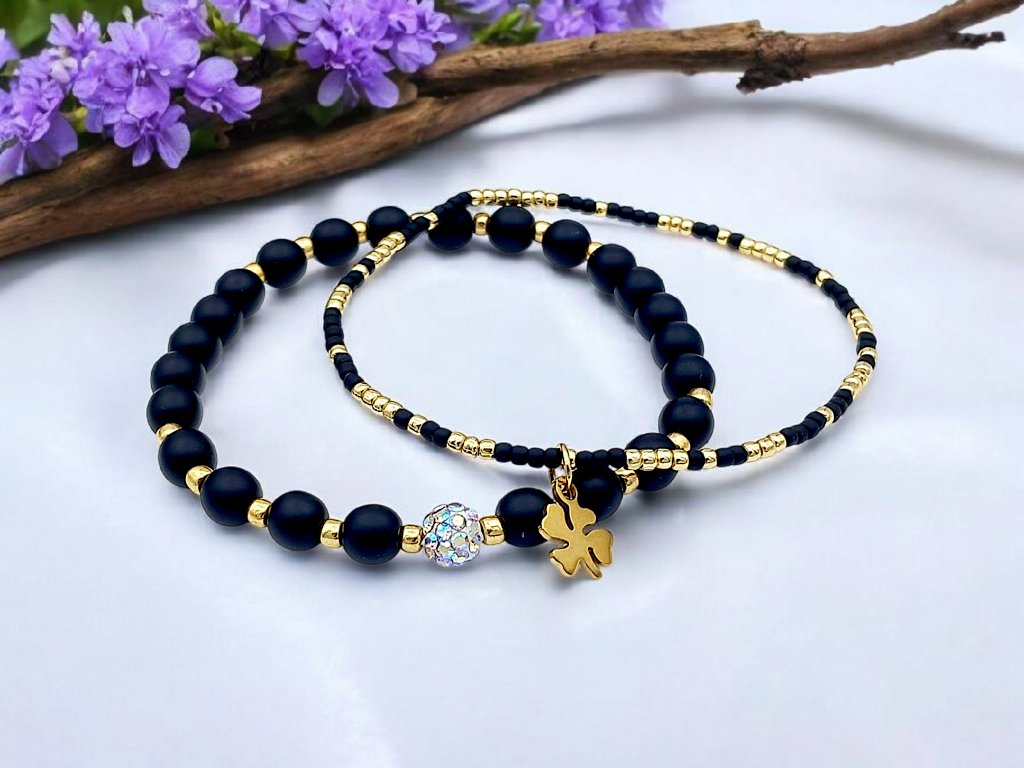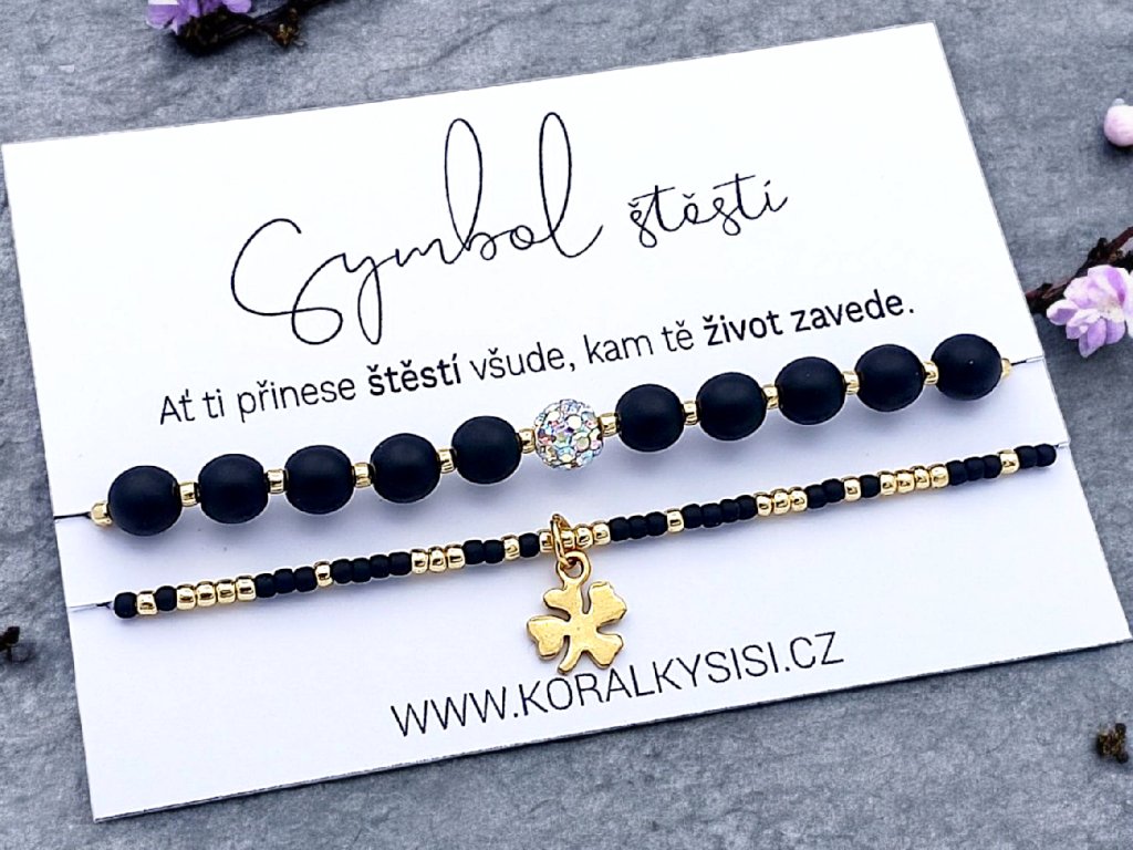 SET náramkov Čierno-zlatý štvorlístok pre šťastie