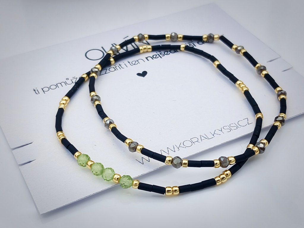 - Korálky: čierne a zlaté sklenené korálky 3 mm, prírodný brúsený olivín 3 mm